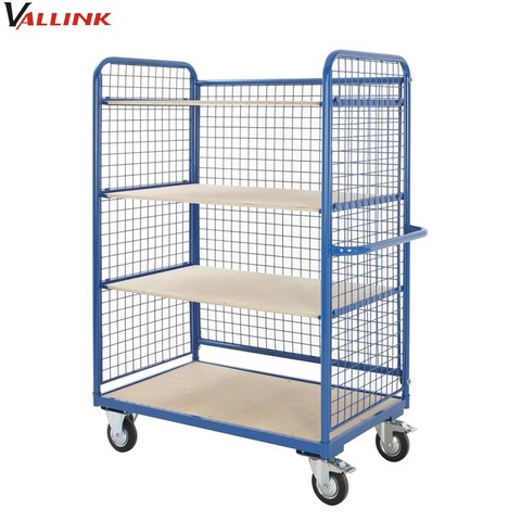 Heavy Duty Steel 4-Wood Decks Mobile Warehouse Storage Trolley with Mesh Sided Shelf & Foldable Four-Wheel OEM Customizable